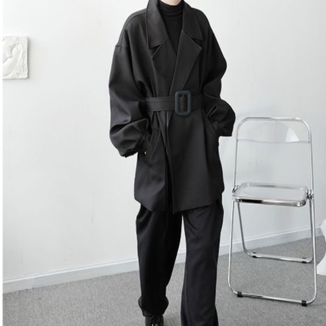 チェスターコート ボタン無し ベルト リブ袖 ミドル丈 ブラック 黒 メンズ シック モード きれいめ 韓国 お支払い後日以内に発送 Out086 Garcons